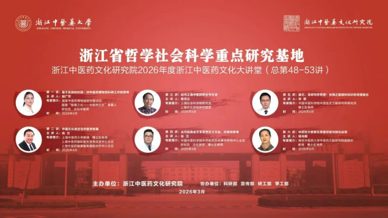 2026年浙江省哲学社会科学重点研究基地浙江中医药大学浙江中医药文化研究院浙江中医药文化大讲堂第48—53讲开讲了!当前,国内外著名中医医史文献、中医药文化、医疗社会史研究专家庚续讲座,由朱德明教授全面主持。6位讲座专家(按讲座时间,依次排列)是: